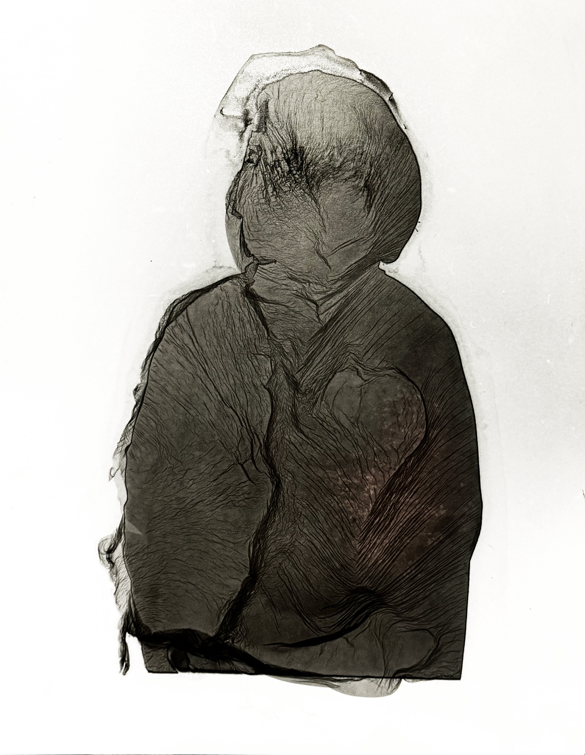 Obscura is a series of mordançage prints exploring women, fabric, and the fragile architectures of perception. A woman in a black abaya becomes both subject and surface; her image dissolves, folds, and reforms in silver and shadow, as do the objects around her.