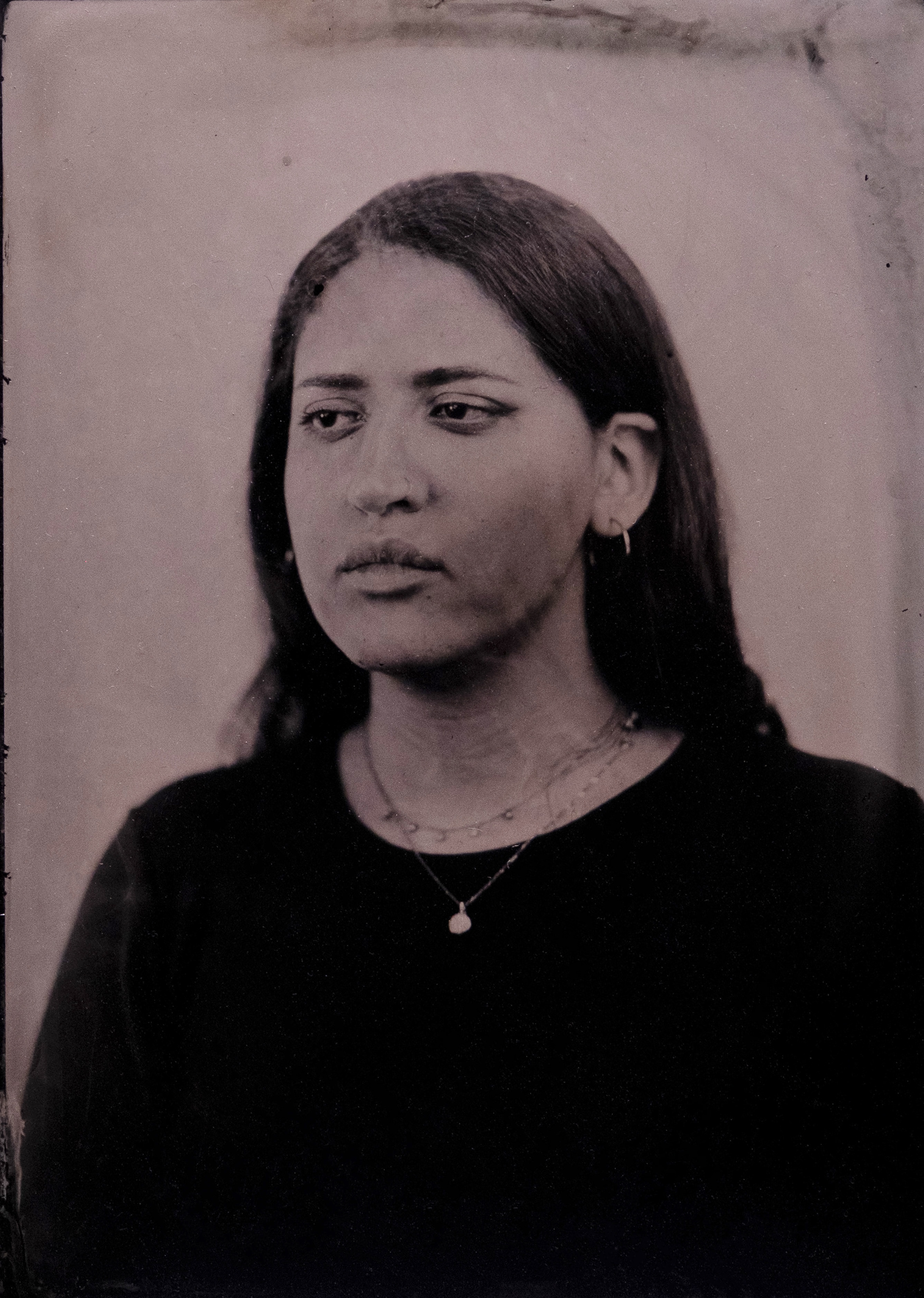 Temporal Dialogues (2025) is part of a series of self-portraits in which I embody my grandmother through costume and gesture. By placing myself in her image, I imagine the life she lived and collapse the distance between our generations, creating a visual conversation across time. Using the historic photographic method of wet plate collodion on tin, I try to capture the spirit of a life lived in a place and time that no longer exist.